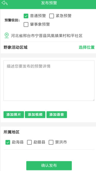 在编辑框内,可以编辑预警详情,添加图片,添加语音或视频,选择地区发布预警,通知周围村民赶紧撤离,