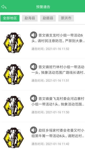 纳亚洲象预警APP是一款实时监测亚洲象活动范围,及时通知周围村民,实现人象和平相处的辅助工具!发现亚洲象踪迹及时通过APP,使当地村民能及时做好防护措施,避免人象冲突发生,保障当地所住居民的生产生活安全。