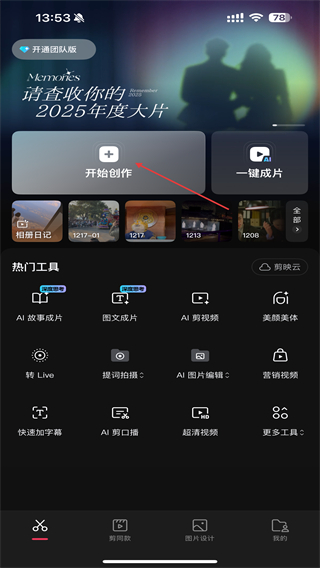 1、打开剪映的App,在首页点击开始创作的功能按钮。