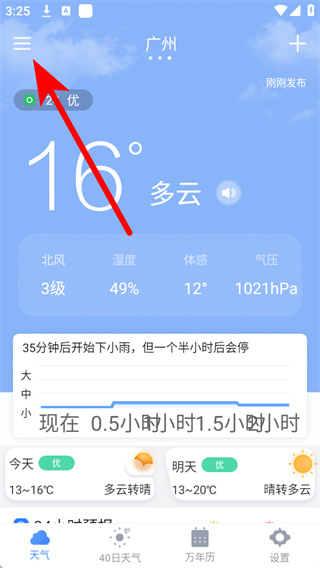 1、打开u天气,点击左上角三条杠,进入城市管理页面。