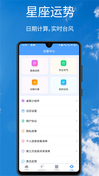 显示温度趋势、降雨趋势,日历模式显示未来15天的天气信息、黄历宜忌数据。