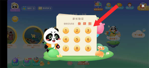 2、在家长验证的界面,依次点击数字叁、肆、捌,完成验证。