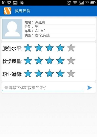 4.点击一条学时明细后的气泡按钮进入该条学时教练评价页面,完成教练星级评分和评语填写后,点击蓝色箭头保存该条学时教练评价