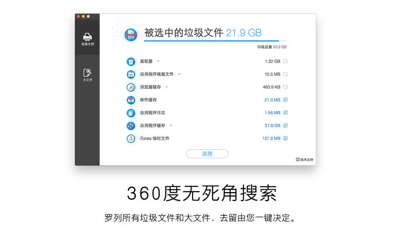 Dr. Cleaner for mac(苹果磁盘清理工具)是趋势科技为苹果用户量身打造的一款磁盘清理和系统优化软件,集内存优化、磁盘清理、大文件扫描等3大特色功能,当真是磁盘和内存的清理专家,现在Dr. Cleaner全新改版升级,在状态栏菜单就可以优化内存和清理磁盘,只为通过简单轻松至极的操作为您提供高效快速至极的Mac体验!让您的系统有飞一样的感觉,轻巧,快捷,方便,好用。原来强大的Mac不知道什么时候就卡爆了,原来干净的SSD不知道什么时候就占满了。Dr. Cleaner解决您所有的苦恼!仅需简单几步,Dr. Cleaner 就可以帮您清理垃圾文件、释放内存,使您的Mac体验前所未有的快速顺畅!一般人我们不告诉他,独家首推清理itunes和iOS下载文件功能,让您无忧下载,轻松删除。