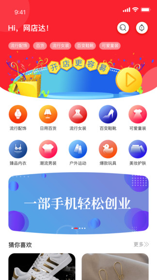 网店达APP整合了市场上的各类货源平台,我们会协助您上架海量物美价廉的上万种一手厂家货源,协助您筛选销售,热门类目比如男装、女装、童装、鞋包帽饰、动漫玩具、日用百货、彩妆内衣、美容护肤、精品母婴、生活家居等产品上万种。
