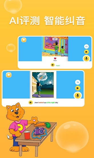 主要功能有:漫画式的教学方法,图文绘本学基础英语;Ai智能语音测评打分,纠正单词发音; 形象生动的画面,让孩子轻松舒适的学习英语口语和听力。