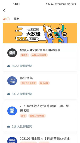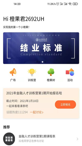橙果邦软件安卓版有丰富的课程知识,主要以金融方面为主,名师在线授课,支持在线学习和考试,还可以查看详细的作业安排,可以回顾往期课程,还可以参加课程训练营,提升自我技能,喜爱的朋友赶快下载体验吧!