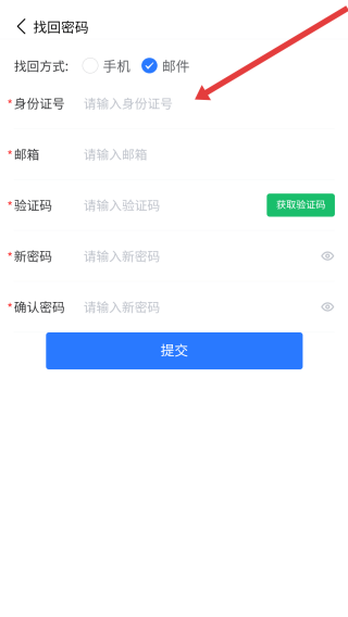 3、找回密码选邮件方式时,先在身份证号栏填信息,再依次填邮箱、验证码等完成重置。