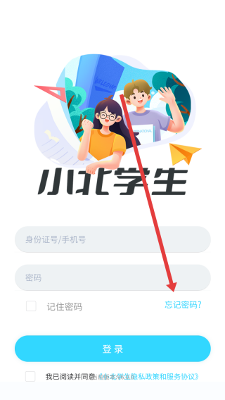 1、在小北学生登录页,若忘记密码,点击忘记密码选项进入找回流程。