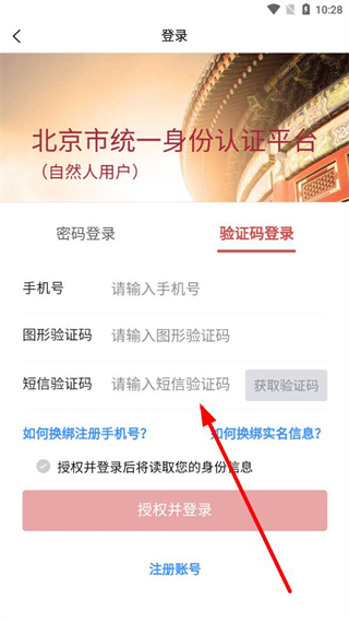 4、在验证码登录界面,依次填写手机号,获取验证码,点击授权并登录完成账号登录。
