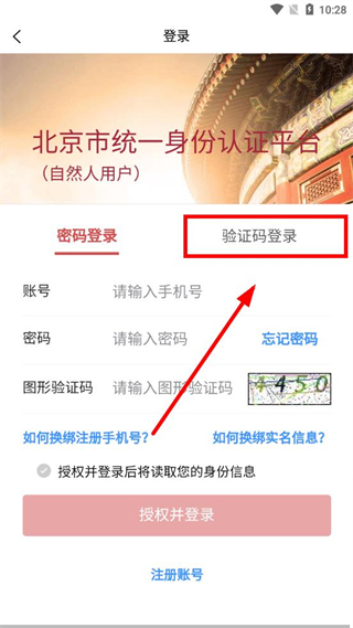 3、在登录页面中,选择验证码登录选项,切换至验证码登录的信息填写界面。