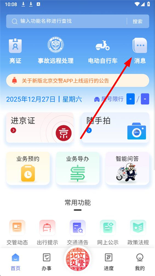 1、进入北京交警app主界面后,点击首页右上角的消息选项,进入消息中心页面。