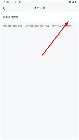 3、在该页面找到首页消息提醒对应的开关,点击将其开启,即可打开首页消息提醒功能。
