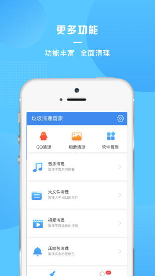 垃圾清理管家你的手机空间管理助手,一键清除手机自带的垃圾文件,为手机腾出空间。强力的垃圾清理引擎,全盘扫描帮你找出根深蒂固的深层垃圾文件,为你一键优化清理。还有支持聊天软件一键清除对话中产生的文件,还有支持隐私保护,把重要文件锁起来。欢迎有需要的朋友下载使用!