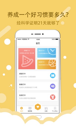 有多少次嚷嚷着要早睡、要运动却迟迟没有行动?有多少次设了目标却半途而费?让小日常21天打卡来帮助你,遇见更好的自己,克服自己的惰性,定制目标,助你21天养成一个又一个好习惯。