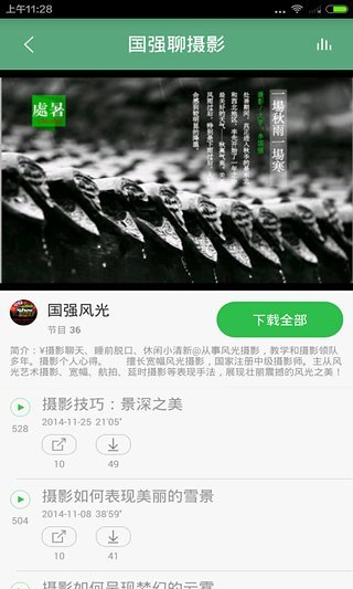 摄影教程技巧app是专为爱好拍照摄影人士定制的一个摄影教程电台,每天为你提供各种摄影教程和摄影技巧,摄影基础、摄影美学原理、实战演练、后期及器材保养。