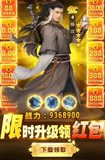 射雕巨额红包版是根据射雕故事改编的武侠手游。跌宕的故事剧情设计,国风特效引人入胜。为玩家们提供了黄蓉、郭靖小龙女、杨过经典的侠客职业角色。可以在线自由养成喜欢的武侠角色,体验浪漫的武侠社交互动玩法。
