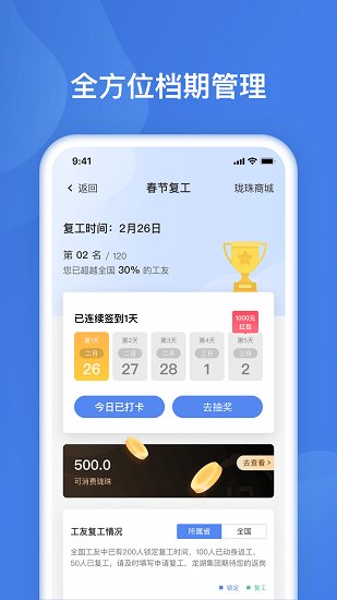 根据工地要求,快速高效完成日常上工档期预设及打卡签到,记录工作细节,并及时分享给施工相关人员。