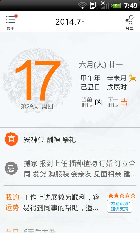 2.以中国风的方式.将黄历.周易.缘分.万年历等传统元素巧妙地与天气结合;