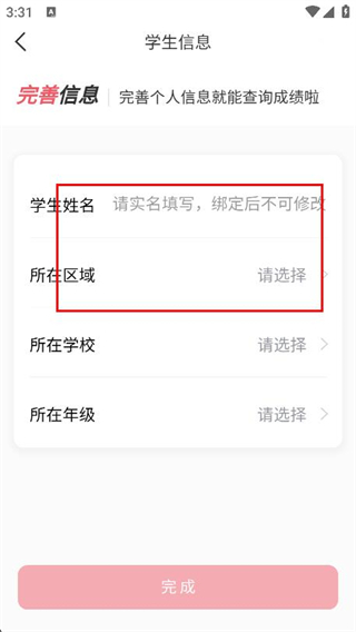 4、选择学校和年级,点击完成即可完成信息绑定操作。