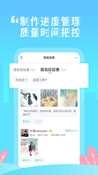 详细的报名申请系统,招募选定的音乐人并开始签约;