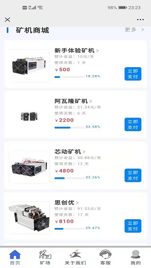 1.在铭启航APP的矿机商城内,用户可通过租赁来获取矿机的使用权。不同矿机型号、使用期限与自身收益是有差异的,因此费用也不同。用户可根据自身情况与需求,租赁不同类型的矿机挖矿,以获得更好的收益。