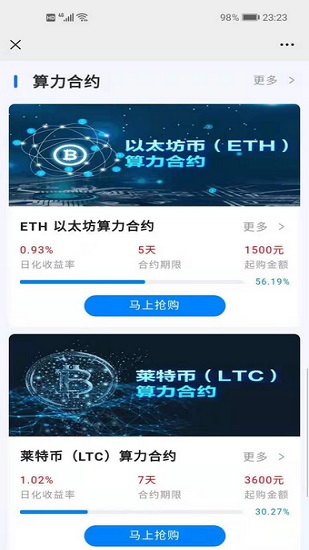 3.除了租赁矿机云挖矿,在铭启航APP的用户也可以抢购算力合约来获取收益,与矿机一样,不同的算力合约在收益率、投资周期、起购金额等方面有所差距,用户可以结合自身能力与需求进行购买。