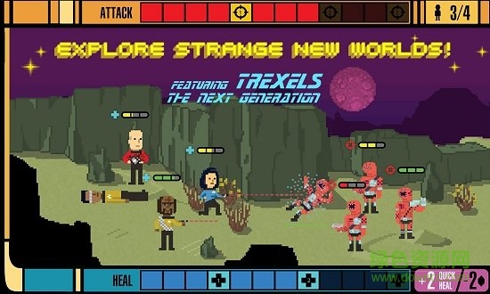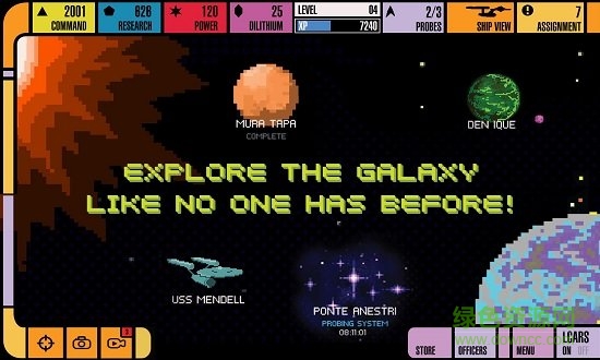 2.浮夸的色彩以及离奇古怪的造型设计是该作画面上的一大特点。另外游戏的音乐也是取材于上世纪的经典原剧作。该作在这次发布上线中,更是采用了tng和tos相结合的手法。不仅采纳了原剧作舰长kirk还有船员spock的任务原型,而且像素风的画面穿插着,使得该作在发展上也算是进步不小了,不过只能算是鼓励一下了。