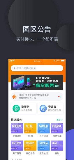 临空集商通给需要的用户朋友带来非常方便的企业园区服务软件,不仅具有简洁大气的界面更有丰富的功能等你来体验,支持实时公告各种企业园区消息更有专业的服务模式以及贴心的客服为你服务,软件功能多多上手容易值得一试。需要的朋友赶紧来下载吧!