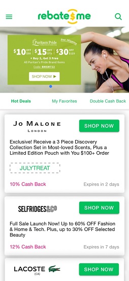 rebatesme是一款非常专业的海外购物优惠券领取软件,不仅具有简洁大气的界面更有丰富的功能等你来体验,支持在线查询各种不同类别商品的优惠券以及礼品卡等等,更可以网购返利让你轻松省钱购物,软件功能多多上手容易操作简单。需要的朋友赶紧来下载吧!