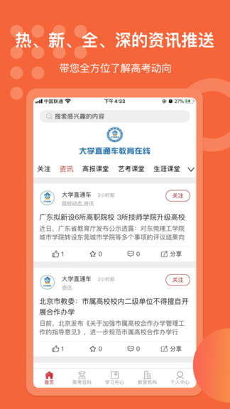 大学直通车安卓手机版专为高三学子打造,可以在手机上查看最新的大学和高考相关资讯,支持在手机上进行志愿填报服务,还有非常贴心的指导服务,同时针对每一个科目还有详细的学习内容,欢迎大家下载使用!