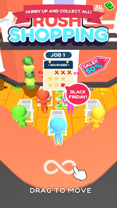 抢购大作战,疯狂血拼开启抢购之旅,游戏的场景位于一座商城,游戏中玩家将需要做的事情就是及时抢走新颖的商品,货架上的商品价格不一,越是昂贵的货物收益就越高,游戏中购买下单需要时间,玩家需要赶在商品抢玩之前多多抢走商品,成为抢购大赢家!