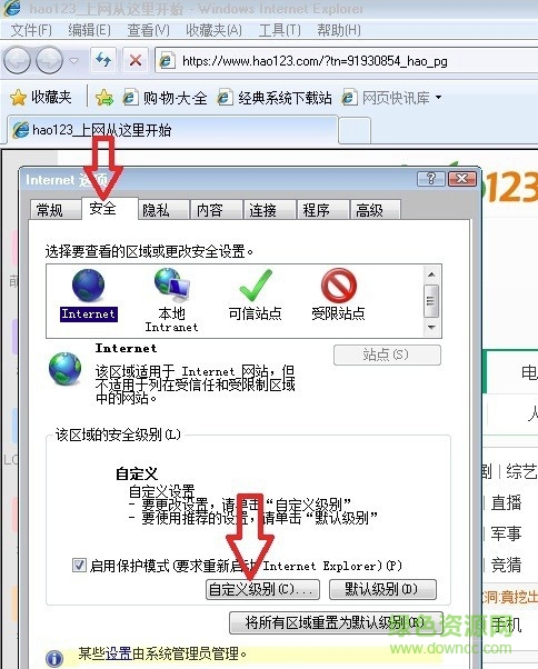 2,进入“Internet 选项”窗口后,选择“安全”这一项,然后点击“自定义级别”按钮。