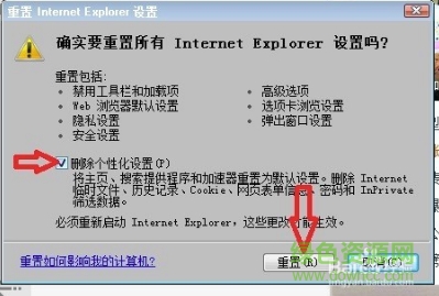 6,进入“重置Internet Explorer设置”窗口,找到“删除个性化设置”这项,然后将其勾选,按“重置”按钮,将“Internet 选项”所有项目重置回默认状态。