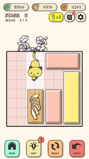 3、移动方块疏通小猫与食物之间的路径,以成功喂食它们。