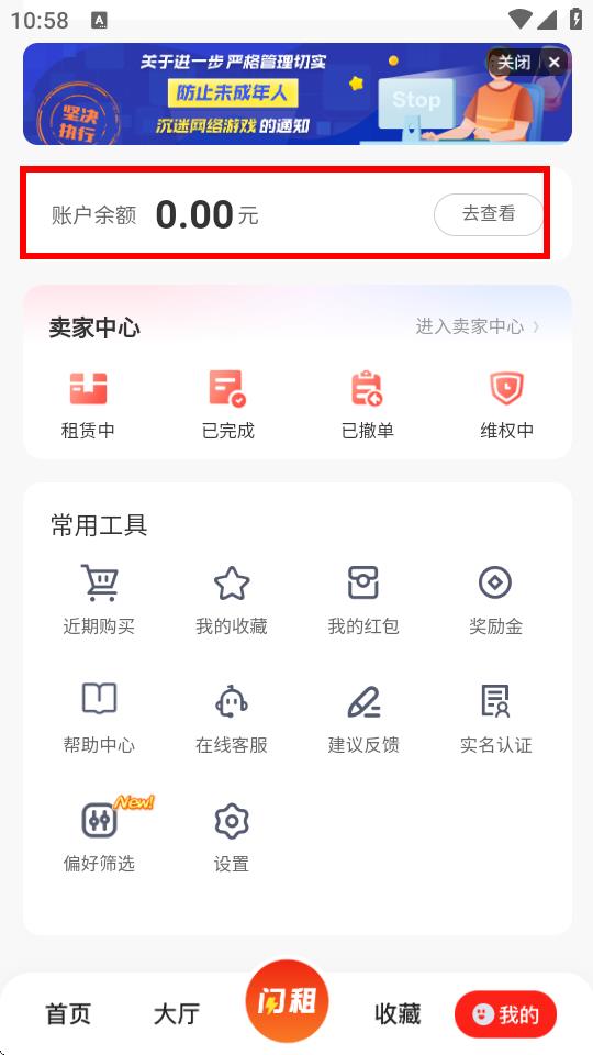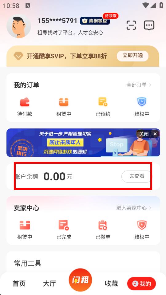 1、打开租号酷APP,点击底部导航栏中的我的进入个人页面。
