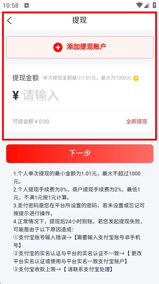4、在提现页面,先点击添加提现账户绑定提现账号,然后输入提现金额,确认信息无误后点击下一步,按提示完成提现操作。