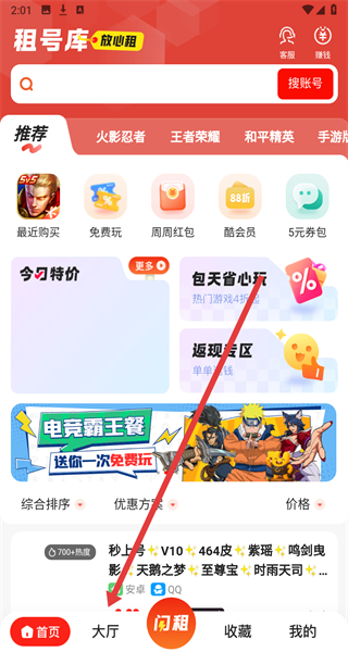 1、在租号库APP首页点击“大厅”,进入租号大厅页面。