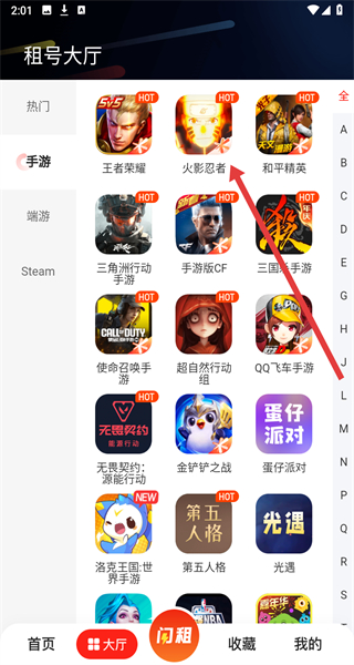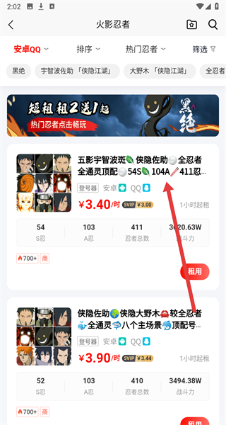 2、租号大厅页面点击“火影忍者”,进入火影忍者租号列表页面。