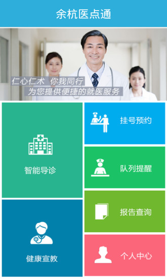 余杭医点通是杭州市余杭区卫生局与中国电信强强联手打造的便民就医应用,整合了智能分诊、预约挂号、队列提醒、 报告查询、健康资讯、个人中心六大板块。