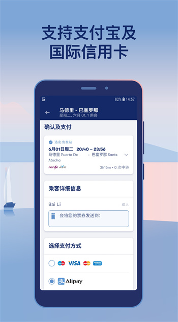 2、支付功能:omio上支持在线支付费用,包括微信、支付宝、花呗、银行卡、信用卡等各种支付方式。