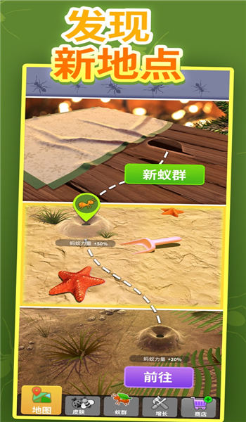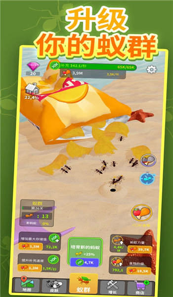 开始虽然只有一只孤独的蚂蚁,但当你在这款闲置游戏中一直吃下去,就会添加更多的蚂蚁到你的群落。