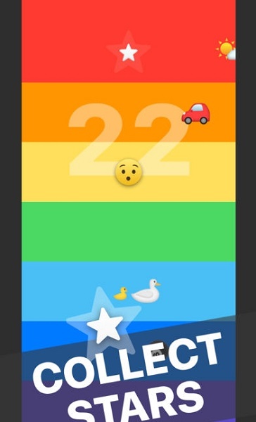 彩虹阶梯中会随机出现一些白色星星,你的任务就是不停变换表情,让 Emoji 上升或下降来吃到星星,同时躲避阶梯上移动的汽车 ??、云朵 ??、鸭子 ??等等障碍物,然后获得分数。