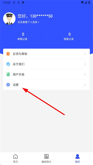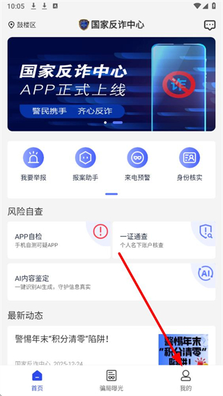 1、打开国家反诈中心APP首页,可以通过点击底部导航栏的我的,进入个人中心页面。