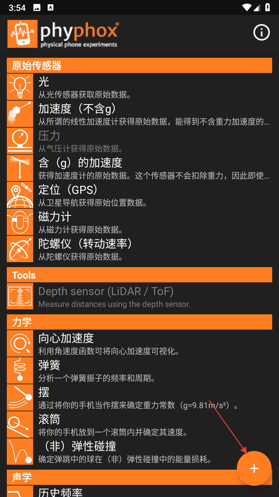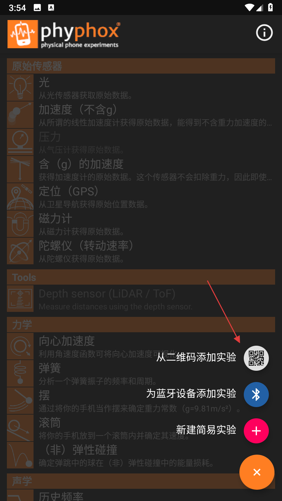 1、打开Phyphox应用,在主界面找到右下角橙色+按钮,点击该按钮,弹出包含从二维码添加实验,为蓝牙设备添加实验,新建简易实验的选项列表。