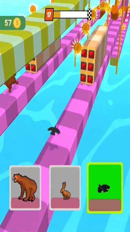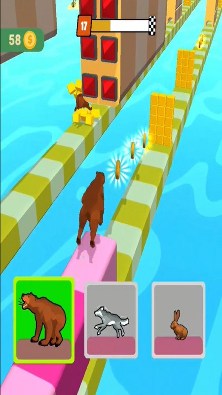 在这里你将见识到动物进化的过程,奔跑的过程中不断的收集食物,你将会进化成为其他的品种,这样就能轻松的粉碎障碍物并继续前进。如果无法破开前方的墙壁,那么挑战也将会自动失败,同时也要避免那些危险的机关,操作非常简单,极易上手的规则和玩法等你来尝试。