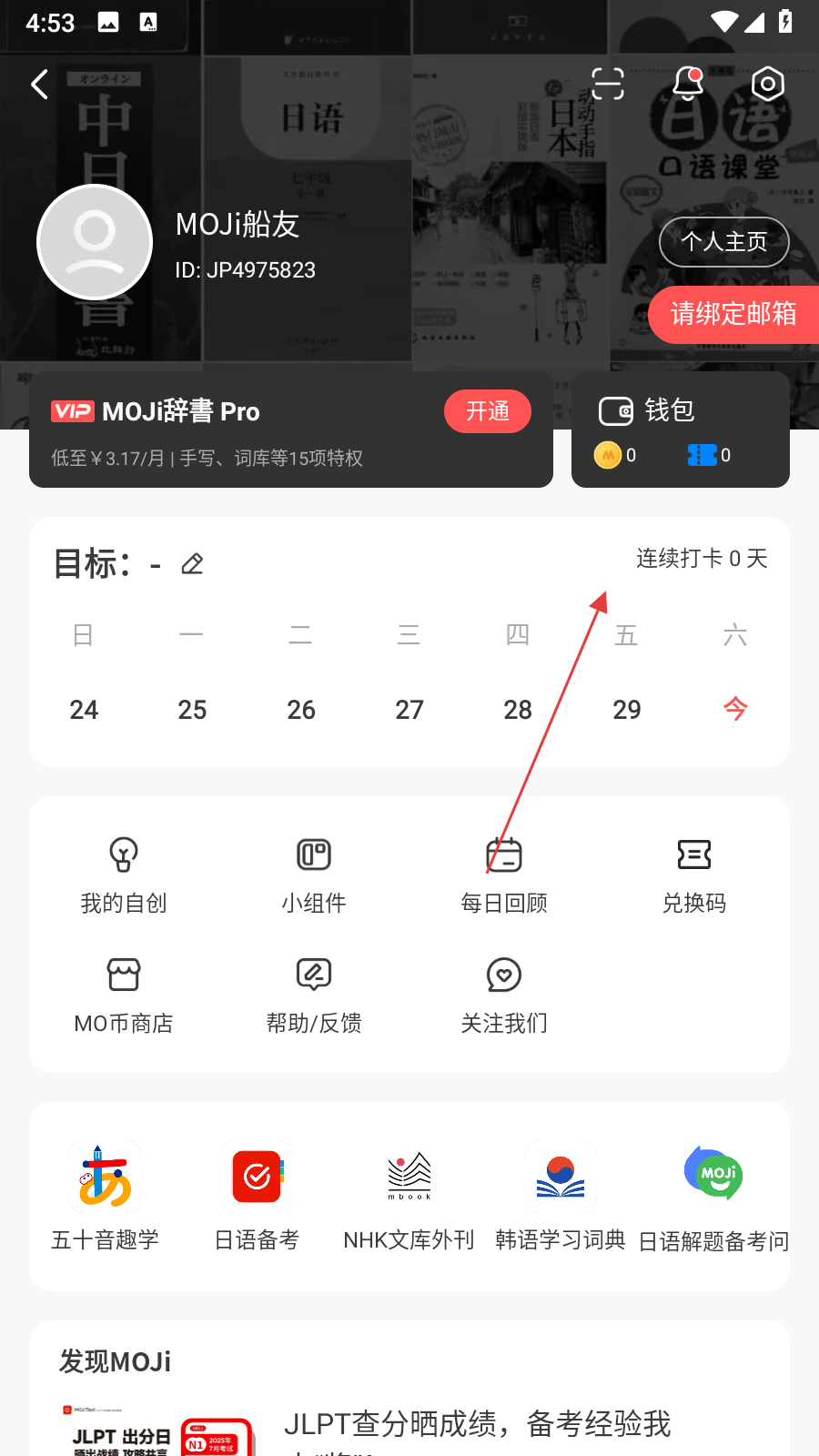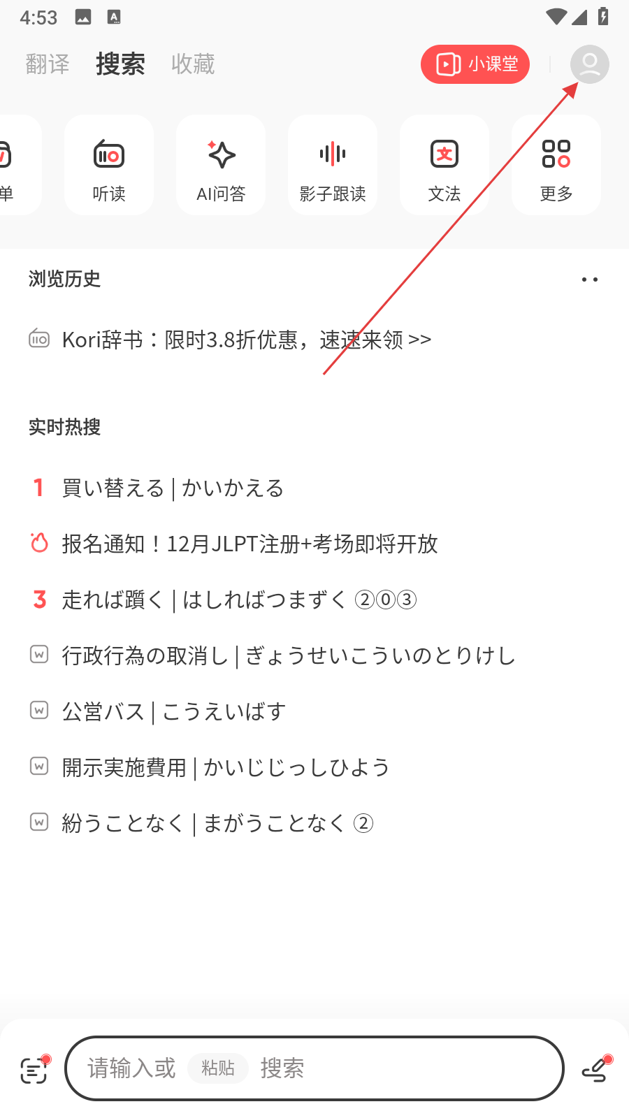1、打开moji辞书应用,点击页面右上角的头像图标,进入个人中心页面。