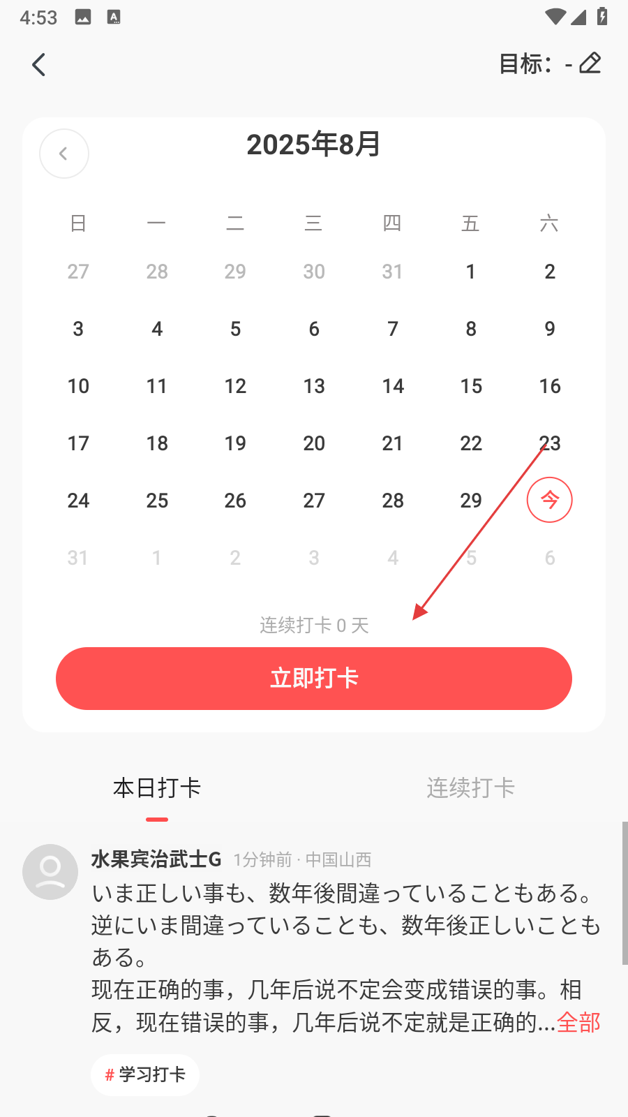 3、在打卡日历界面中,点击红色立即打卡按钮,完成当日打卡操作。