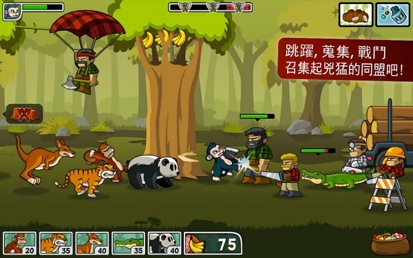 2、本作共有 66 道关卡之多,初期游戏会让玩家先学习一些玩法技巧,通过点击左右半屏来让猴子在几颗大树之间移动并拾取香蕉,而这些香蕉就是出兵所需要消耗的资源。和一些对推塔防游戏不同,这里并没有人口限制一说,只要香蕉足够,待各个动物的 CD 冷却之后,想出多少都行,当然这也是因为公益作品的缘故,难度的设定上不会过份为难大家。