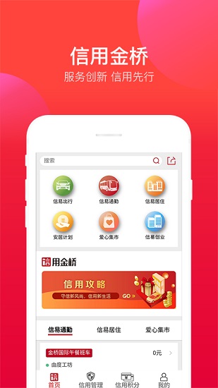 信用金桥是一款基于“守信激励”为核心的在金桥园区内享受餐饮娱乐折扣、交通出行便利、人才激励补贴、创业办公优惠等为一体的app,全方位为园区内20万员工和碧云社区居民提供优惠便捷的服务。
